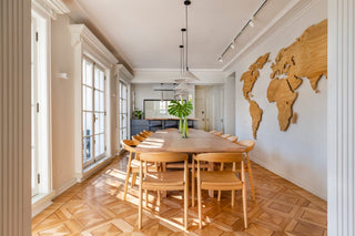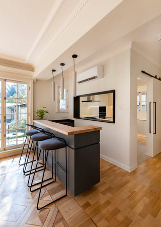 En el resto de las habitaciones instalamos pisos de parquet nuevos, todo en Eucaliptus. En el segundo piso trabajamos las ventanas, fabricando réplicas idénticas para mantener la estética original.
