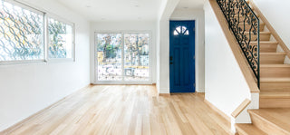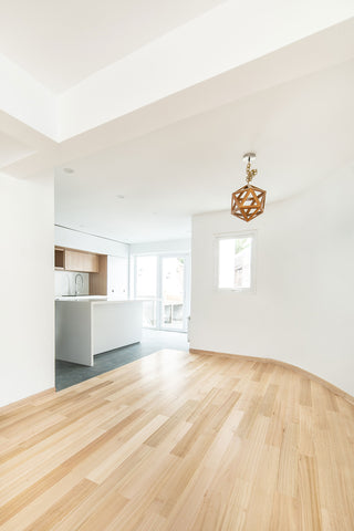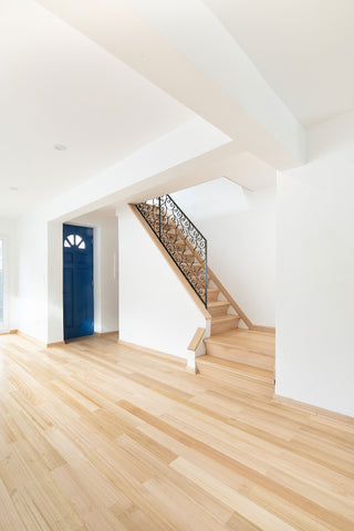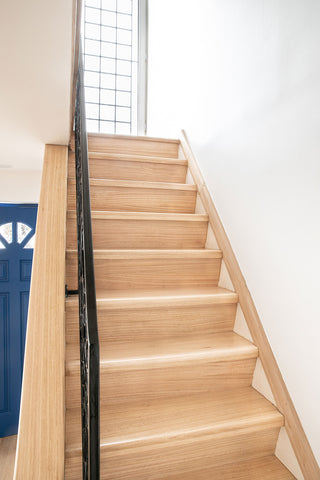 También estuvimos encargados de revestir la escalera, fabricando e instalando cada grada a medida. El diseño del piso es Dandy en Eucaliptus, diseño que logra lucirse especialmente en el primer piso al ser el sector más iluminado de la casa.
