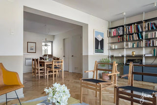 En este proyecto de departamento en providencia, nuestro aporte fue la fabricación e instalación de nuestro piso de parquet diseño Herringbone en madera Eucaliptus.