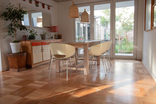 En esta residencia de abundante iluminación, el parquet acoge cada espacio, complementándose con el estilo y diseño propios de sus habitantes.