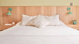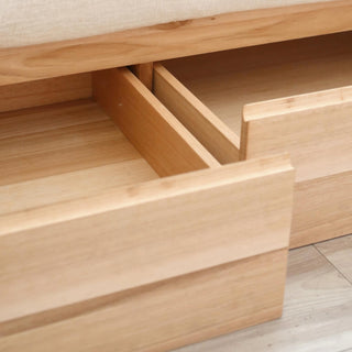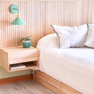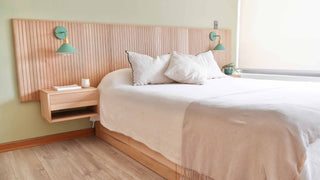 Proyecto integral de dormitorio donde fabricamos e instalamos nuestro respaldo de cama Kiel, cama con seis corridas de cajones diseño Berne y un set de veladores Sike a cada lado. Todo fue fabricado en madera de Eucaliptus que con sus tonalidades claras resaltó la iluminación del espacio.