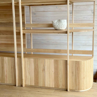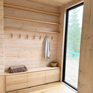 El proyecto también contempló el diseño de muebles para el hall de entrada, incluyendo repisas y percheros. Todo fue diseñado y fabricado en Eucaliptus.