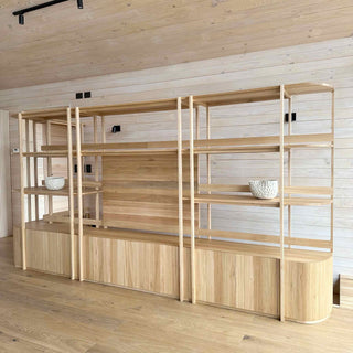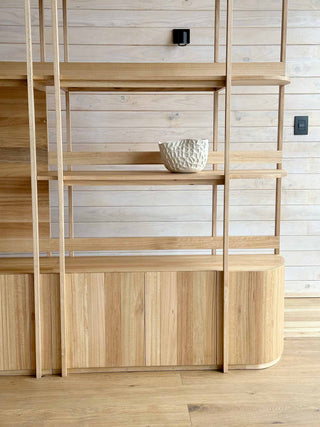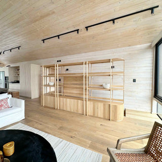 La propuesta contempló un estante tipo librero central para el living comedor de la casa. Cumple un rol protagonista en el espacio, y también, funciona como división ya que esconde detrás la bajada de la escala para el piso de abajo.