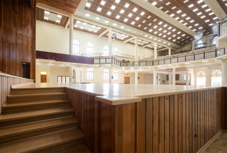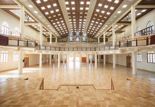 Nuestra colaboración en el proyecto fue en la fabricación e instalación de 1270 m2 de piso de madera en Eucalitpus. La propuesta consideró dos diseños, los cuales permitieron demarcar la delimitación del recorrido, del pre-altar y áreas para las bancas dentro del gran salón. Se consideraron detalles de filetes de Coigue, gradas y contrahuellas en Eucaliptus.