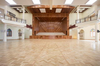 Piso de parquet nuevo en altar, sector del coro, salas contiguas, gran salón y accesos con soluciones de gradas y contrahuellas para la Iglesia Evangélica Pentecostal, en La Calera, Región de Valparaíso.